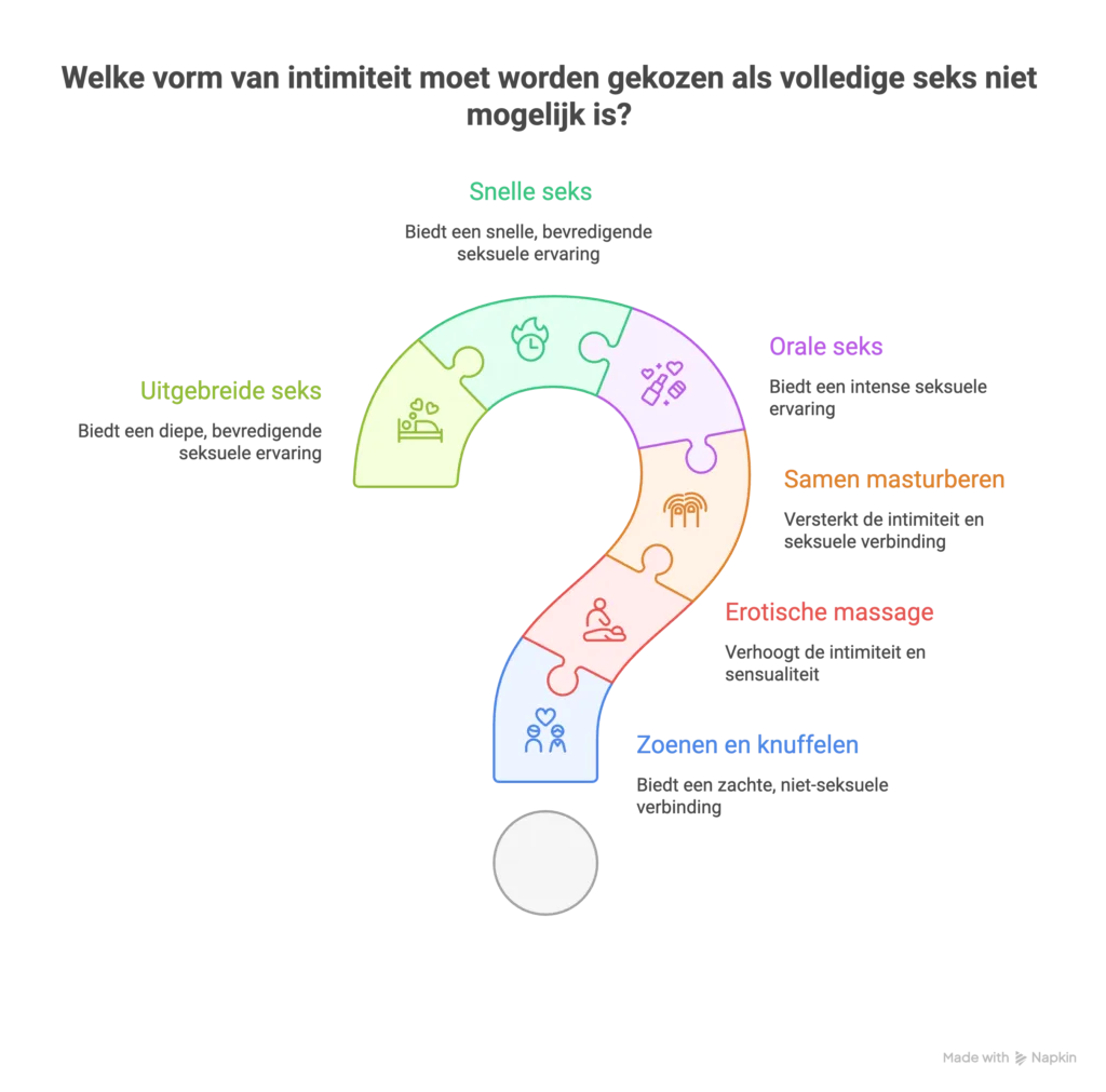 Want seks is een spectrum. Aan de ene kant heb je zoenen op de bank, naakt knuffelen, elkaar masseren met erotische intentie. Verder op het spectrum vind je samen masturberen, orale seks voor één partner, een snelle vrijpartij, of juist een uitgebreide vrijpartij. Als volledige seks nu niet lukt, kies dan bewust voor een andere vorm van intimiteit in plaats van helemaal nee te zeggen. Die keuze maakt het verschil tussen afstand en verbinding.