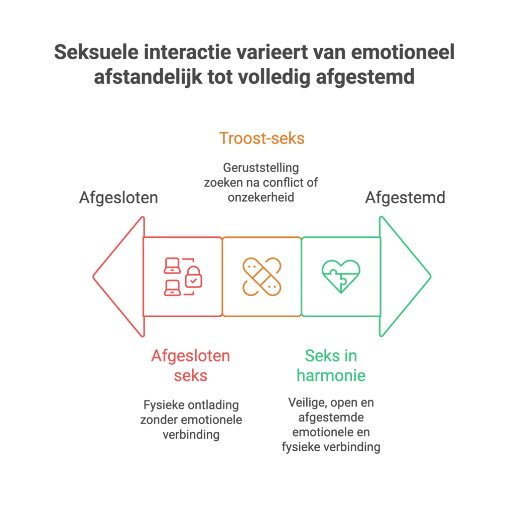 In de relatietherapie onderscheiden we drie kwalitatieve typen seksuele interactie die veel zeggen over hoe het met jullie emotionele band staat. Het herkennen van deze patronen kan jullie helpen begrijpen waar jullie vastzitten.