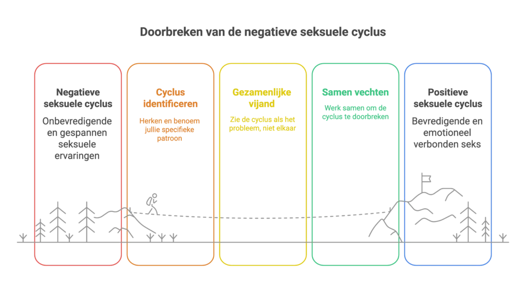 Het helpt om samen jullie specifieke cyclus in kaart te brengen. Ga op een rustig moment bij elkaar zitten en probeer de dans te beschrijven die jullie doen. Wat doet de één, hoe reageert de ander, en waar eindigen jullie telkens? Geef het patroon desnoods een naam – “onze seks-stress cyclus” of “de afwijzing-druk spiraal” – zodat jullie het kunnen herkennen als het weer gebeurt.